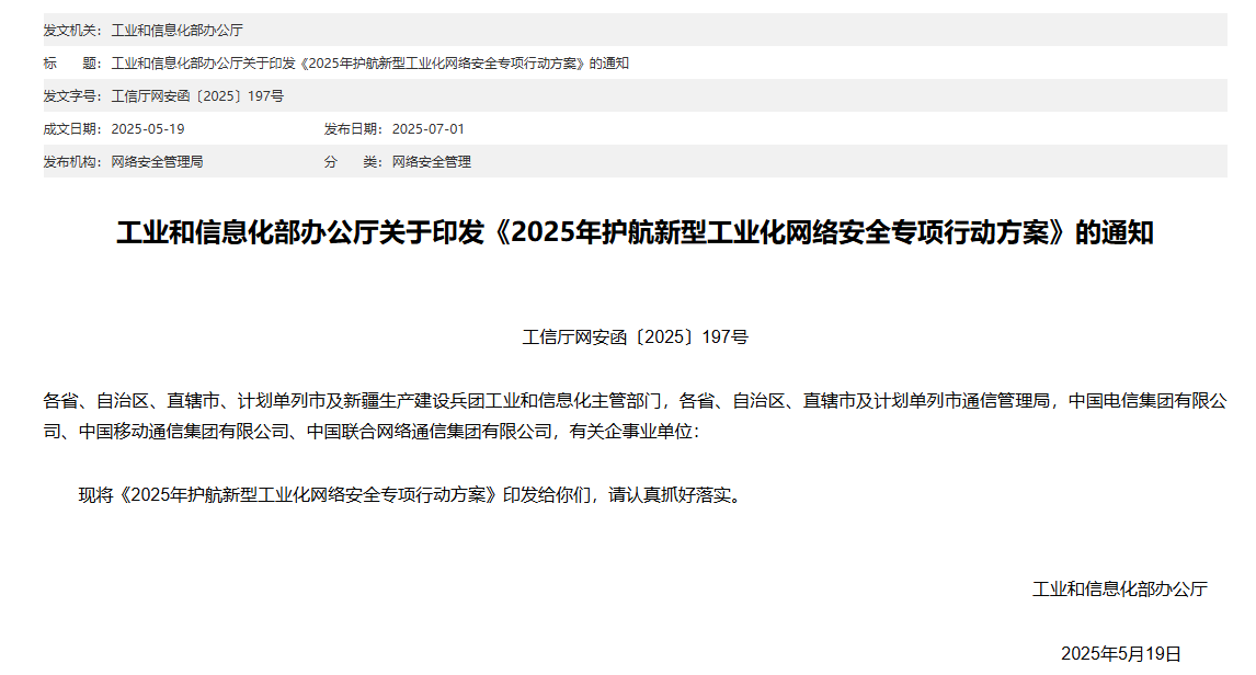 為深入學(xué)習(xí)貫徹習(xí)近平總書(shū)記關(guān)于新型工業(yè)化的重要論述,全面貫徹落實(shí)中央經(jīng)濟(jì)工作會(huì)議精神和全國(guó)新型工業(yè)化推進(jìn)大會(huì)部署,扎實(shí)推進(jìn)2025年護(hù)航新型工業(yè)化網(wǎng)絡(luò)安全專(zhuān)項(xiàng)行動(dòng),工業(yè)和信息化部印發(fā)《2025年護(hù)航新型工業(yè)化網(wǎng)絡(luò)安全專(zhuān)項(xiàng)行動(dòng)方案》。