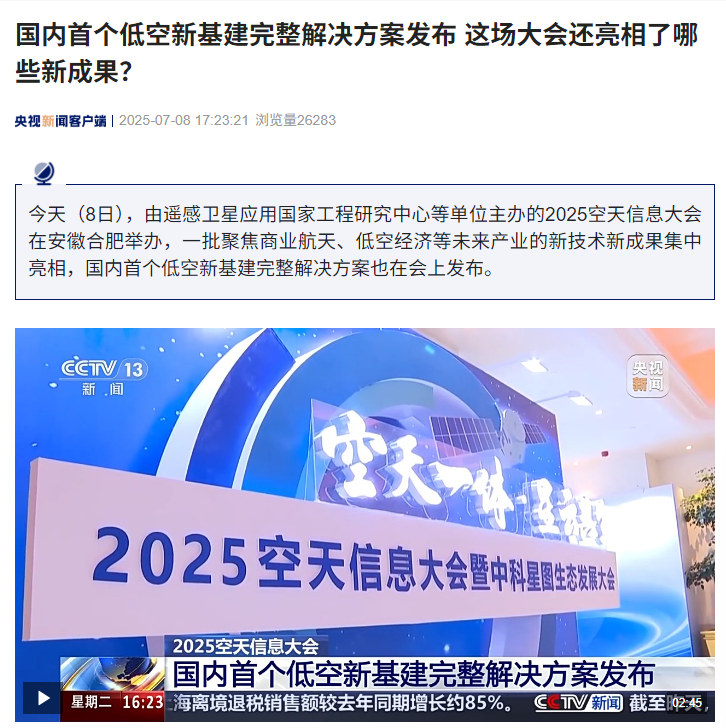 7 月 8 日消息,據(jù)央視新聞報道,由遙感衛(wèi)星應(yīng)用國家工程研究中心等單位主辦的 2025 空天信息大會于今日在安徽合肥舉辦,一批聚焦商業(yè)航天、低空經(jīng)濟(jì)等未來產(chǎn)業(yè)的新技術(shù)新成果集中亮相,國內(nèi)首個低空新基建完整解決方案也在會上發(fā)布。