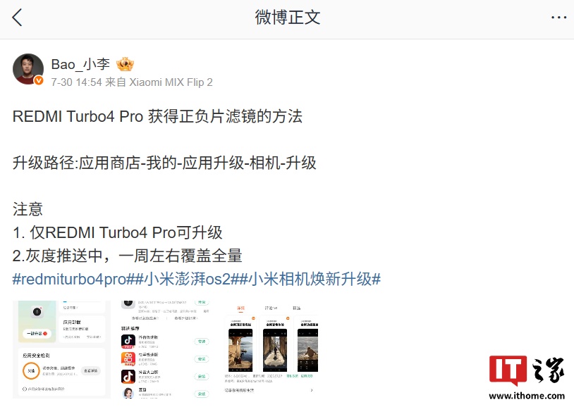7 月 31 日消息,小米相機(jī)部的產(chǎn)品經(jīng)理 @Bao_小李 昨日發(fā)文稱,REDMI Turbo 4 Pro 手機(jī)升級支持正負(fù)片濾鏡功能。升級路徑: