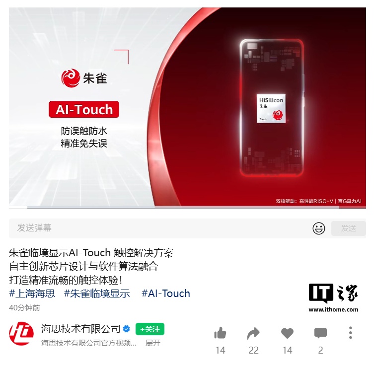 7 月 31 日消息,海思技術(shù)有限公司今日發(fā)文,上海海思朱雀臨境顯示推出 AI-Touch 觸控解決方案,它專為手機觸控量身打造!八邆浞勒`觸防水、又準(zhǔn)又快、強抗干擾的卓越性能,讓你告別手機褲兜誤撥、水珠亂觸、雨天操作失靈等煩惱。”