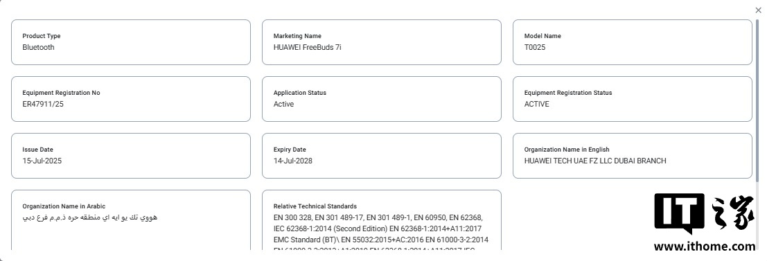 這款產(chǎn)品已經(jīng)取得阿聯(lián)酋 TDRA(電信監(jiān)管局)認(rèn)證,型號為 T0025,設(shè)備注冊號為 ER47911/25。