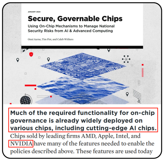 ||新美國(guó)安全中心報(bào)告《安全、可管控的芯片——使用片上治理機(jī)制來(lái)管理人工智能和高級(jí)計(jì)算的國(guó)家安全風(fēng)險(xiǎn)》,報(bào)告中提到,片上治理所需的許多功能已在各類(lèi)芯片上廣泛部署,包括尖端的人工智能芯片。AMD、蘋(píng)果、英特爾和英偉達(dá)等領(lǐng)先企業(yè)銷(xiāo)售的芯片就具備上述諸多政策所需的功能。