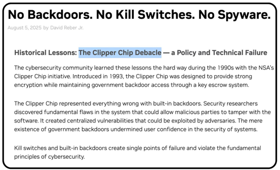 英偉達(dá)在隨后的自辯聲明中提到,芯片沒(méi)有“后門(mén)”,他們還專(zhuān)門(mén)提到了“Clipper芯片”事件。