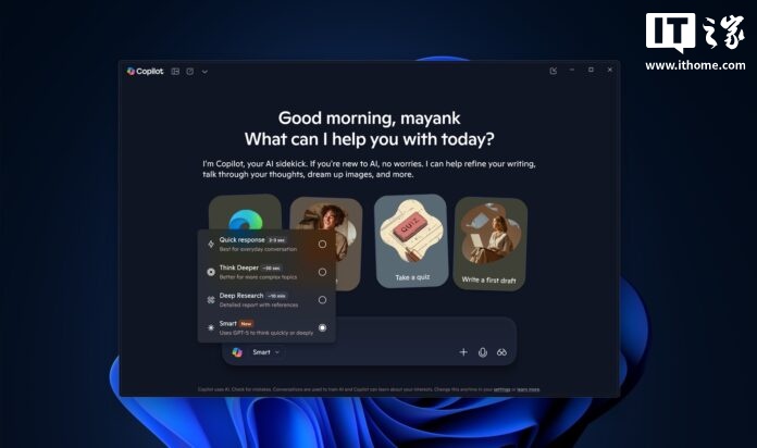 據(jù) Windows Latest 測(cè)試發(fā)現(xiàn),Copilot 應(yīng)用中的撰寫框通過“網(wǎng)絡(luò)路由”功能可自動(dòng)識(shí)別新模型。雖然 Copilot 應(yīng)用本身是原生應(yīng)用,主要使用 WinUI(WinAppSDK)構(gòu)建界面,但撰寫框卻使用了路由功能,能夠從 Azure 自動(dòng)獲取新模型。這意味著用戶無需更新應(yīng)用即可開啟“智能”或 GPT-5 模式,以 Copilot 1.25073.146.0 版本為例,就已具備智能模式。
