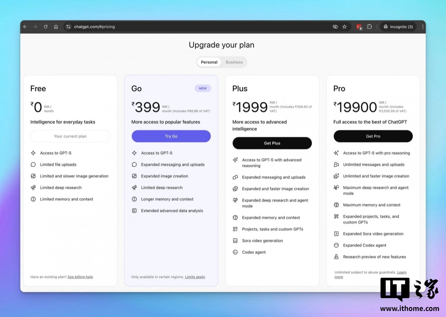OpenAI 推出“ChatGPT Go”低價套餐:僅限特定地區(qū),每月 399 印度盧比