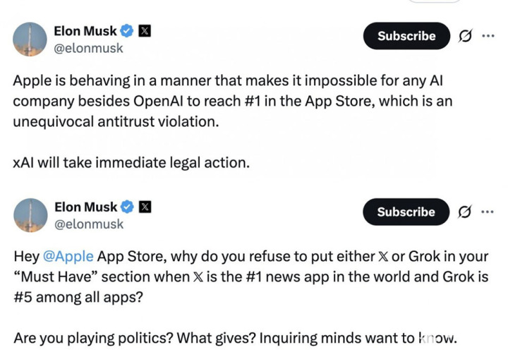本周早些時候,馬斯克在其X中發(fā)文指責蘋果偏袒OpenAI,并將ChatGPT推上App Store排行榜榜首。馬斯克表示,蘋果的這種行為已經(jīng)違反了反壟斷法,xAI“將立即采取法律行動”。
