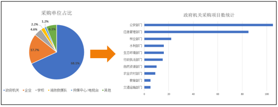相關(guān)機(jī)構(gòu)數(shù)據(jù)顯示,政府部門積極開展無人機(jī)應(yīng)用探索,成為采購的主要力量。從采購主體上看,政府采購項目數(shù)占比為68.1%,大幅領(lǐng)先于其他采購主體,成為電信運營商主要的無人機(jī)項目采購來源。在政府單位中無人機(jī)項目采購量最大的部門分別是應(yīng)急管理部門和公安部門。與政府部門采購相比,企業(yè)采購占比僅為17.7%,但整體呈現(xiàn)逐年增長的趨勢,其中2024年,企業(yè)采購電信運營商無人機(jī)項目數(shù)超過2022年至2023年的總和。