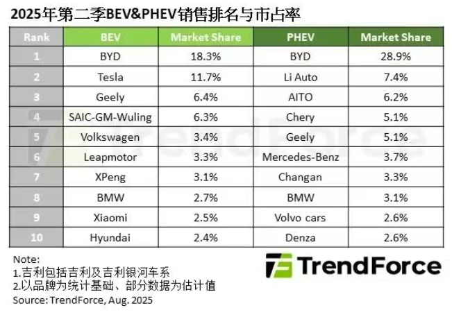 其中,純電車(BEV)銷量達(dá) 328 萬輛,年增 39%。報(bào)告稱,比亞迪以 18.3% 的市占率穩(wěn)居 BEV 最大品牌,銷量年增率高達(dá) 43%。特斯拉雖維持市占第二名,但在中國、北美、西歐等市場表現(xiàn)衰退,即便于韓國、挪威和土耳其有所成長,也難以彌補(bǔ)主要市場的下滑幅度,導(dǎo)致第二季整體銷量年減約 14%。