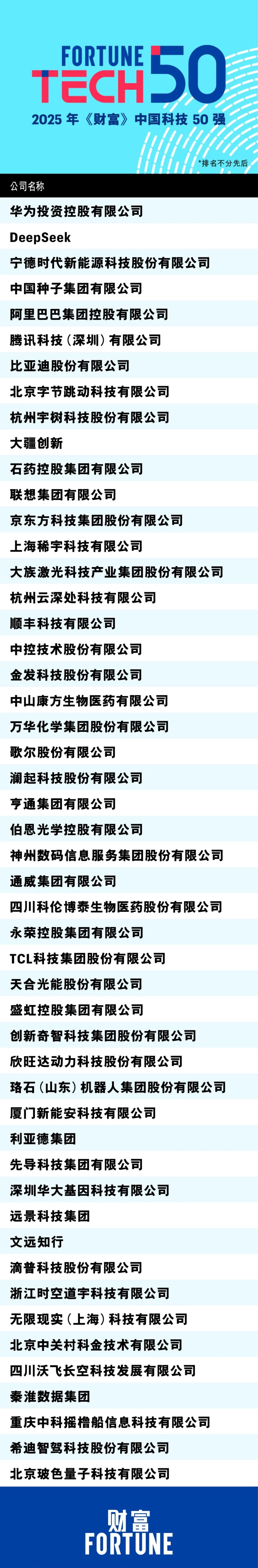 2025 年《財富》中國科技 50 強榜單發(fā)布:華為、DeepSeek、寧德時代等上榜