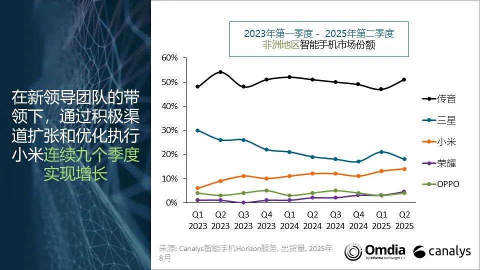 得益于在尼日利亞和埃及的強(qiáng)勁增長(zhǎng)、積極的渠道擴(kuò)張及更深入的本地投資,小米同比增長(zhǎng) 32%,以 14% 的份額奪得第三。