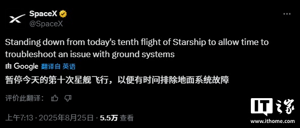 SpaceX 官方剛剛在 X 上宣布,暫停今天的第十次星艦飛行,以便有時間排除地面系統(tǒng)故障。