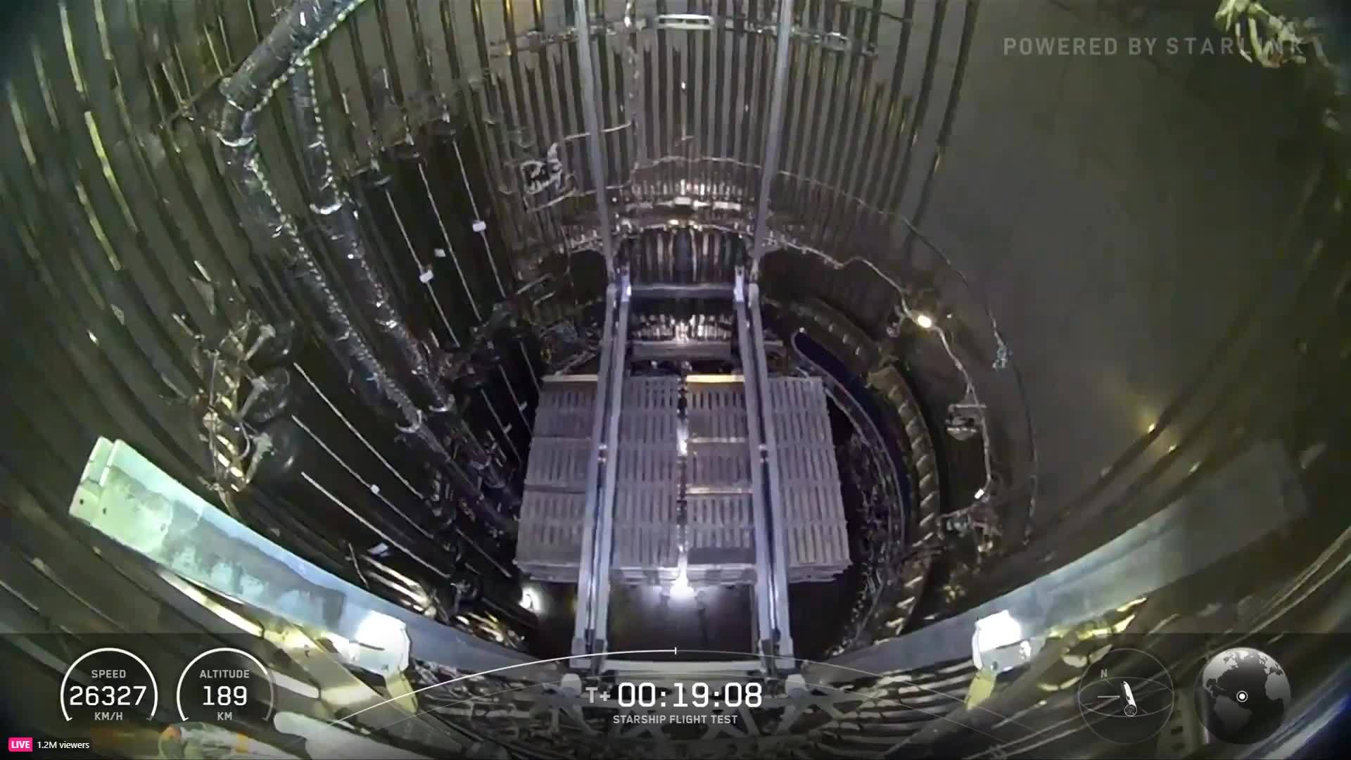 隨后,SpaceX 的星艦重新進入地球大氣層,計劃在印度洋進行軟著陸和濺落,飛船尾部裙板部分受損,襟翼上出現(xiàn)了一些燒穿情況,但飛船仍保持可控。最后,星艦二級成功濺落到印度洋。