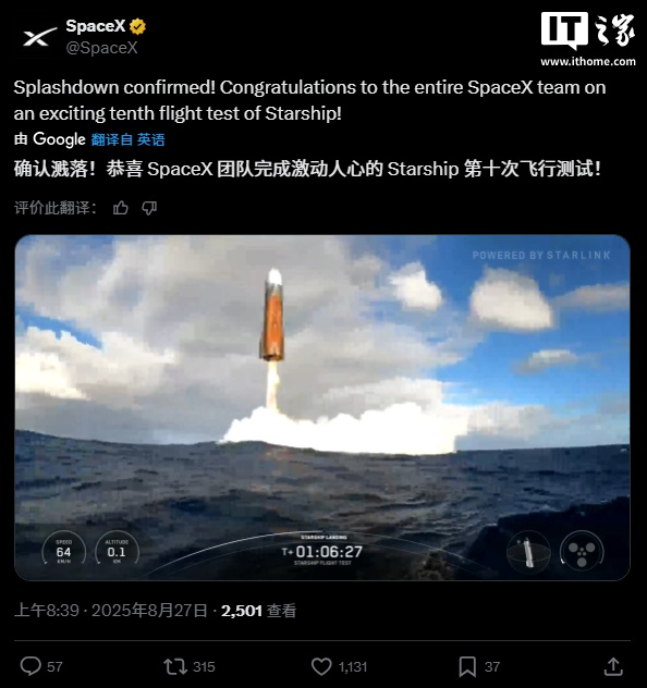 SpaceX 星艦第十次試飛成功,完成多項關(guān)鍵測試