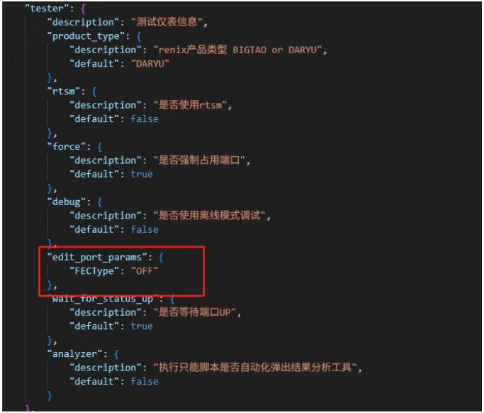 測試儀表產(chǎn)品類型分為BigTao和DarYu,不同端口速率的適配,在testbed.json文件中修改"edit_port_params"可以對測試儀的端口參數(shù)進行設置,如下圖示為端口設置關閉FEC。