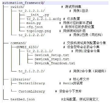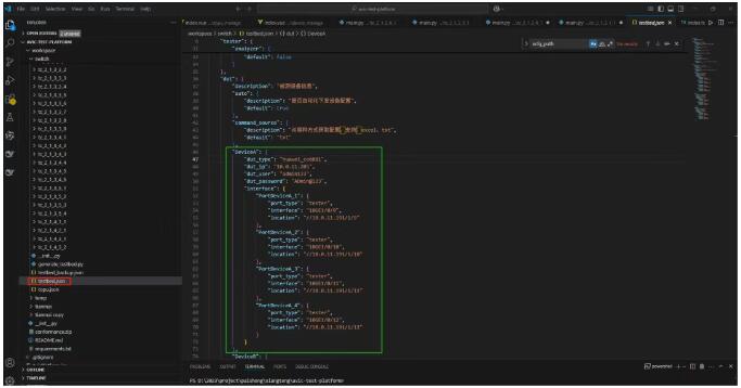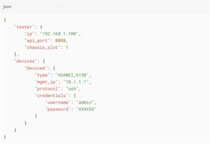 測試拓撲連接信息寫入testbed.json文件中,修改對應的測試儀表,交換機設備的 ip 和實際端口即可適配不同的測試環(huán)境。