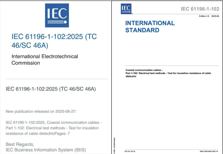 近日,由亨通集團旗下江蘇亨通線纜科技有限公司作為聯(lián)合主導(dǎo)單位,與中國電科第二十三研究所共同開發(fā)的國際標(biāo)準(zhǔn)IEC 61196-1-102:2025,《Coaxial communication cables-Part1-102:Electrical test methods-Test for insulation resistance of cable dielectric》正式發(fā)布。