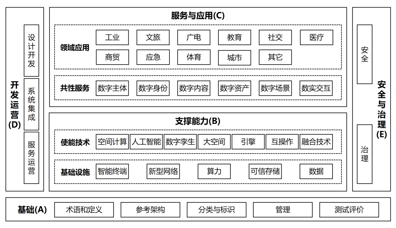 元宇宙標(biāo)準(zhǔn)體系主要包括基礎(chǔ)、支撐能力、服務(wù)與應(yīng)用、開發(fā)運(yùn)營(yíng)、安全與治理等五大部分,如下圖所示: