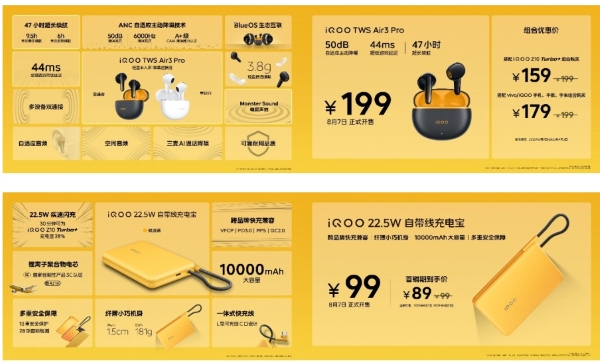 “KPL 推薦耳機”iQOO TWS Air3 Pro 同臺登場,具備"星耀黃"與"星鉆白"兩款配色,帶來 50dB 多模式降噪、44ms 全鏈路游戲低延遲、47 小時最長續(xù)航(搭配耳機盒)以及 3.8g 輕巧佩戴,為消費者帶來輕松聆聽的嶄新選擇。iQOO TWS Air3 Pro 到手價 199 元起,搭配 vivo / iQOO 手機購買更優(yōu)惠。同時開售的 iQOO 22.5W 自帶線充電寶到手價 99 元,首銷期到手價 89 元。