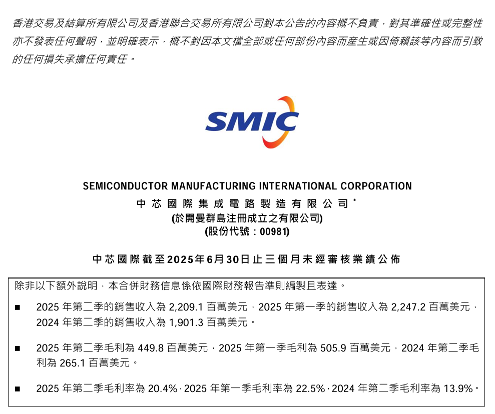 8 月 7 日消息,中芯國際今日發(fā)布截至 2025 年 6 月 30 日止三個(gè)月未經(jīng)審核業(yè)績: