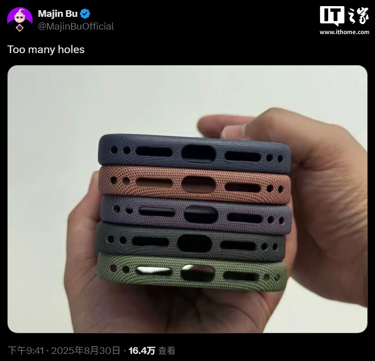 IT之家注意到,Majin Bu 還曝光了 iPhone 17 系列“TechWoven”保護殼,采用多彩編織面料,可以看到底部開孔數(shù)量頗多,預計是為新的掛繩配件鋪路。