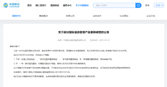 中國移動:9月16日起,對部分國際漫游套餐產(chǎn)品實施調(diào)整