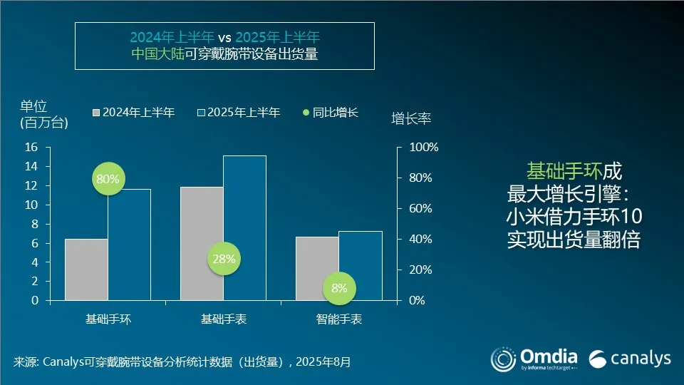 9 月 10 日消息,市場調(diào)查機構(gòu) Canalys 今天(9 月 10 日)發(fā)布博文,稱 2025 年上半年中國大陸可穿戴腕帶設(shè)備出貨量達(dá) 3390 萬臺,同比增長 36%,繼 2024 年下半年 33% 的增長后持續(xù)強勢攀升,創(chuàng)歷史新高。
