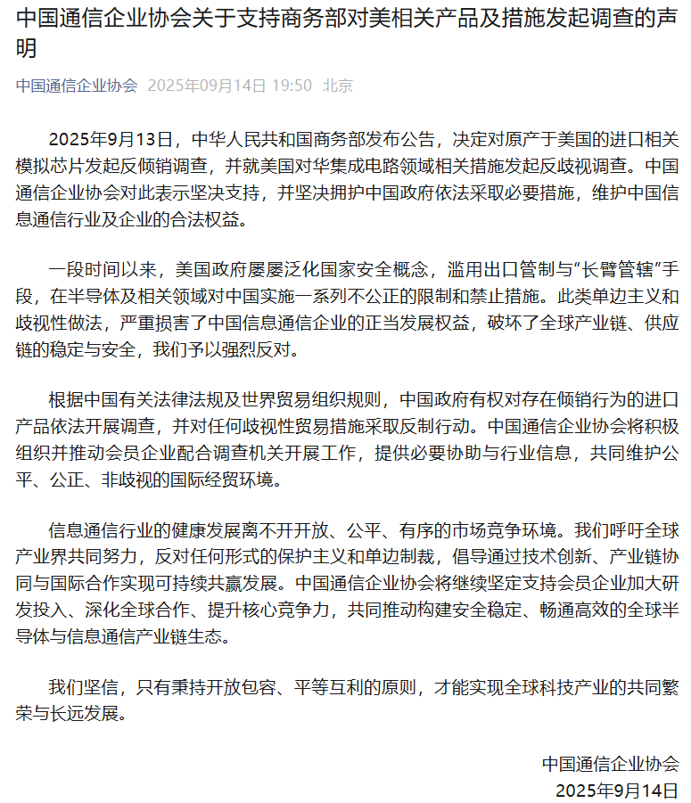 2025 年 9 月 13 日,中華人民共和國商務(wù)部發(fā)布公告,決定對原產(chǎn)于美國的進(jìn)口相關(guān)模擬芯片發(fā)起反傾銷調(diào)查,并就美國對華集成電路領(lǐng)域相關(guān)措施發(fā)起反歧視調(diào)查。中國通信企業(yè)協(xié)會對此表示堅(jiān)決支持,并堅(jiān)決擁護(hù)中國政府依法采取必要措施,維護(hù)中國信息通信行業(yè)及企業(yè)的合法權(quán)益。