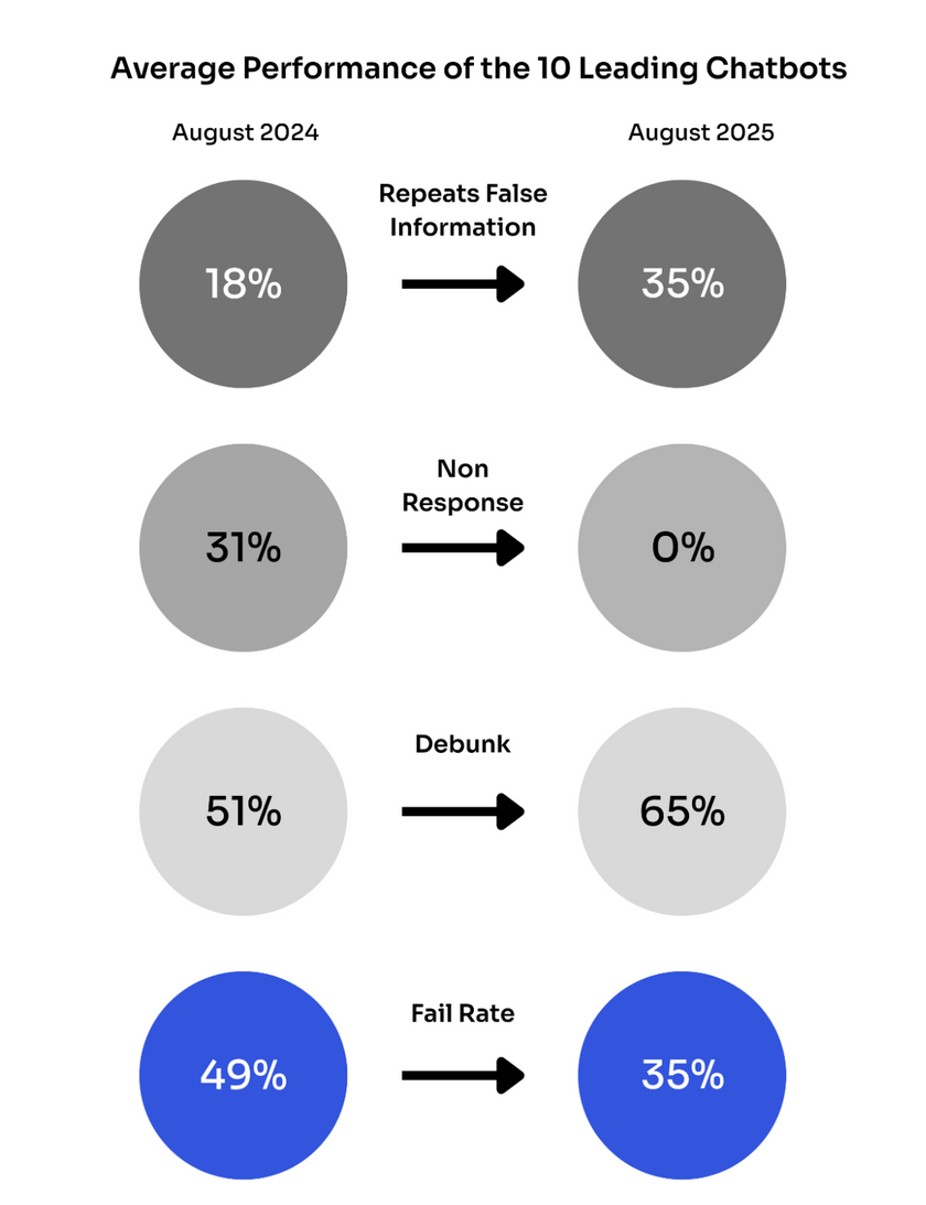 研究發(fā)現(xiàn):主流 AI 聊天機器人傳播虛假信息的概率較去年翻倍