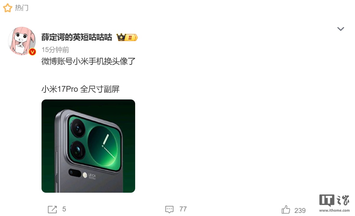 小米手機(jī)官博頭像意外泄露新機(jī)背屏,預(yù)計(jì)為 17 Pro 系列