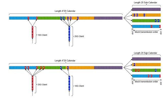 FlexE Shim 時隙配置,通過 Calendar 機制,為每個Client接口提供靈活、動態(tài)可調的配置。不同速率的Client接口,F(xiàn)lexE Shim將其業(yè)務數(shù)據(jù)按5G的顆粒度,靈活分配到業(yè)務承載通道上,實現(xiàn)多種速率接口靈活復用。