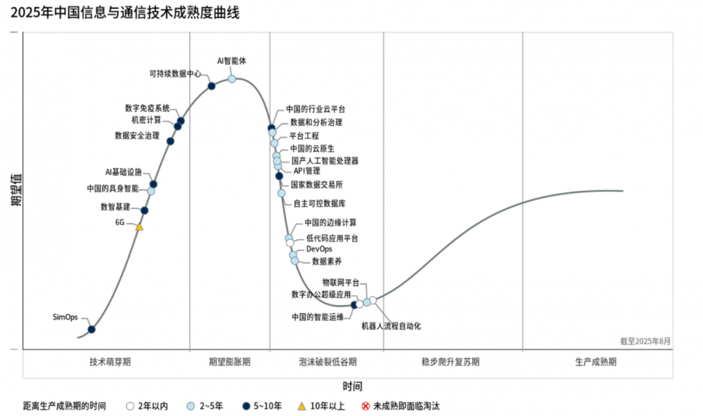 IT行業(yè)的技術(shù)更迭是無(wú)法忽視的,CIO不僅希望通過“平衡游戲”來(lái)貢獻(xiàn)業(yè)務(wù)價(jià)值,也希望理解技術(shù)相關(guān)發(fā)展的最新動(dòng)態(tài)。在此次成熟度曲線報(bào)告中,部分技術(shù)因?yàn)檫^時(shí)而被移除,或是被新技術(shù)所取代。其中比較明顯的案例便是5G被6G取代、生成式AI被AI智能體取代、工業(yè)互聯(lián)網(wǎng)被物聯(lián)網(wǎng)平臺(tái)取代。同時(shí),像是去年中還存在的“數(shù)據(jù)中臺(tái)”因?yàn)楸徽J(rèn)為過時(shí)而移除,但在曲線中放入了新的“數(shù)智基建”。而像“軟件定義廣域網(wǎng)”“混合云計(jì)算”已經(jīng)不再是CIO的優(yōu)先事項(xiàng),現(xiàn)已變?yōu)榛A(chǔ)設(shè)施經(jīng)理需要關(guān)注的技術(shù),所以也在曲線中進(jìn)行了移除,也減輕了CIO的負(fù)擔(dān)。