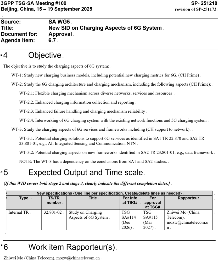 據(jù)介紹,在 9 月 16 日至 19 日于北京召開的 3GPP 業(yè)務(wù)與系統(tǒng)技術(shù)規(guī)范組(TSG SA)第 109 次全會上,由中國電信研究院牽頭的“6G 系統(tǒng)計(jì)費(fèi)研究”項(xiàng)目正式獲批通過,實(shí)現(xiàn)中國電信在 3GPP 國際標(biāo)準(zhǔn)組織的 6G 牽頭立項(xiàng)突破。該項(xiàng)目是 3GPP SA5 工作組首個(gè)獲批的 6G 項(xiàng)目。