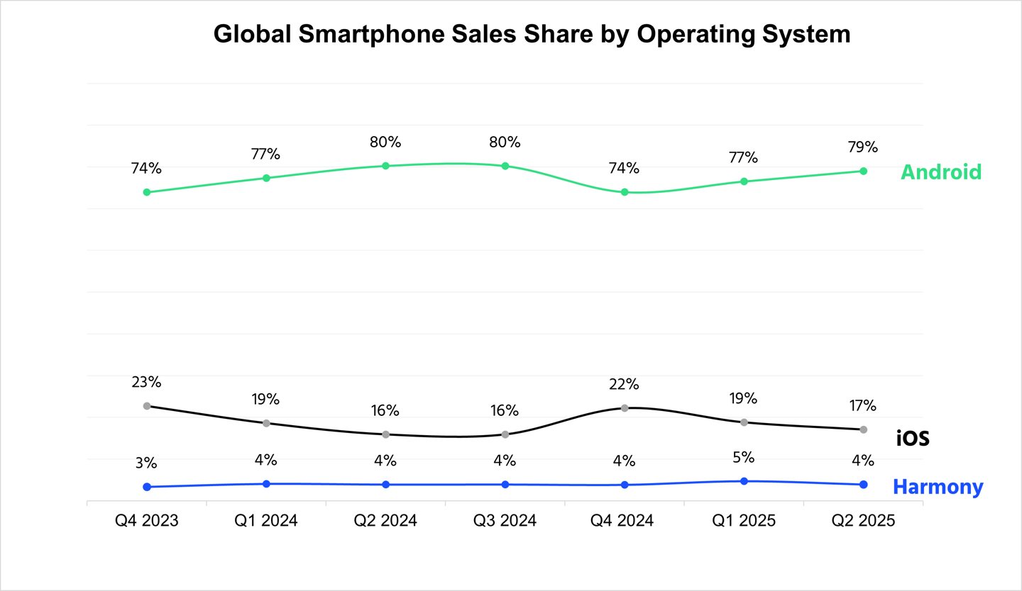 市場調(diào)查機構(gòu) CounterPoint Research 昨日(9 月 22 日)發(fā)布博文,報道稱在 2025 年第 2 季度全球智能手機銷量同比增長 5%,其中安卓系統(tǒng)占比 79%,蘋果 iOS 系統(tǒng)占比 17%,鴻蒙系統(tǒng)占比 4%。