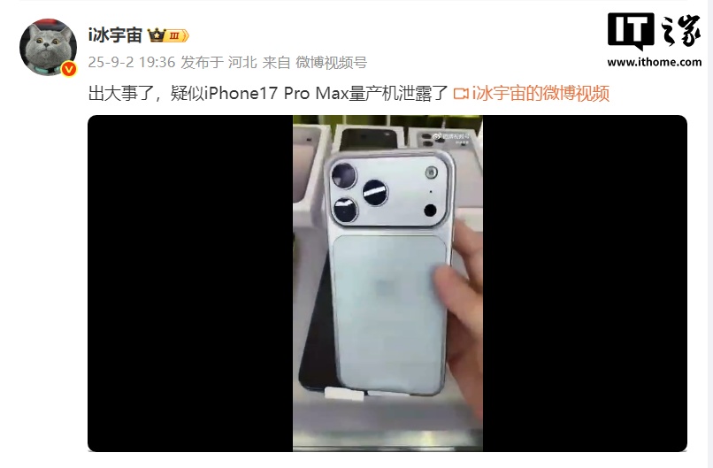 9 月 2 日消息,蘋果 iPhone 17 / Pro 系列手機(jī)預(yù)計(jì)將在 9 月 10 日凌晨的發(fā)布會(huì)上推出,博主 @i冰宇宙 今日曬出視頻,稱“疑似 iPhone 17 Pro Max 量產(chǎn)機(jī)泄露”。
