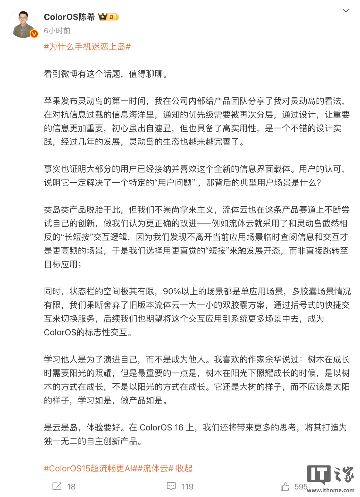 9 月 4 日消息,OPPO ColorOS 設(shè)計(jì)總監(jiān)陳希今天下午在微博發(fā)文談“為什么手機(jī)迷戀上島”,其表示,看到微博有這個(gè)話(huà)題,值得聊聊。